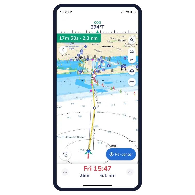 View your live position and check your Course Over Ground (COG) and Speed Over Ground (SOG) in real time. Concentric circles around your position quickly show the distance between you and key features around you.